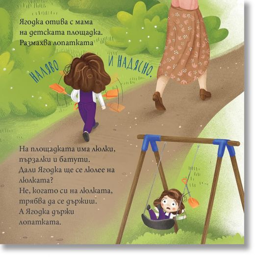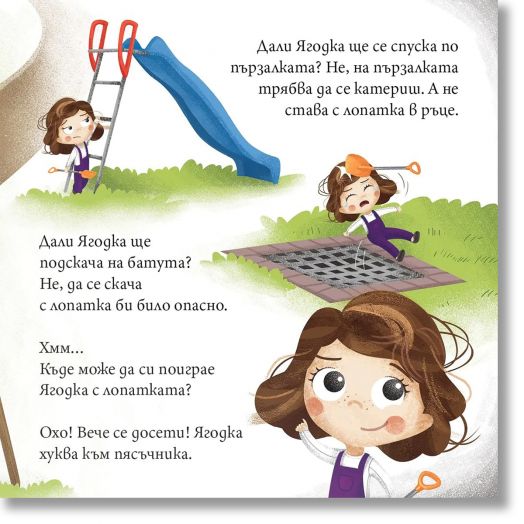 С кратък текст, цветни илюстрации и въпроси за разговор след всяка страница, „Ягодка Петрова не си дава лопатката“ е чудесен избор за четене преди или след игра на площадката.
