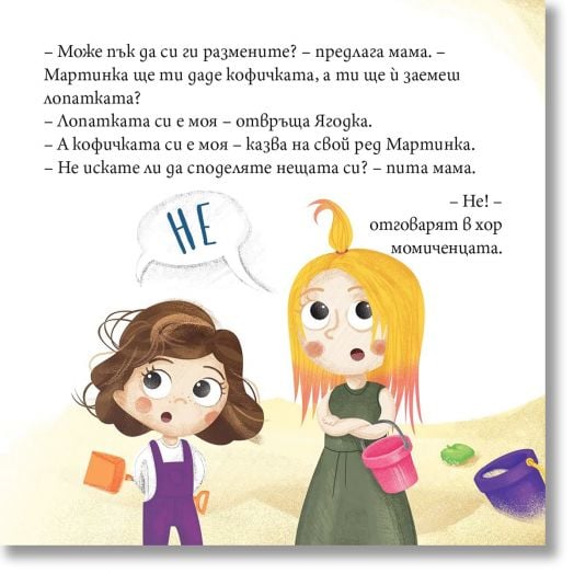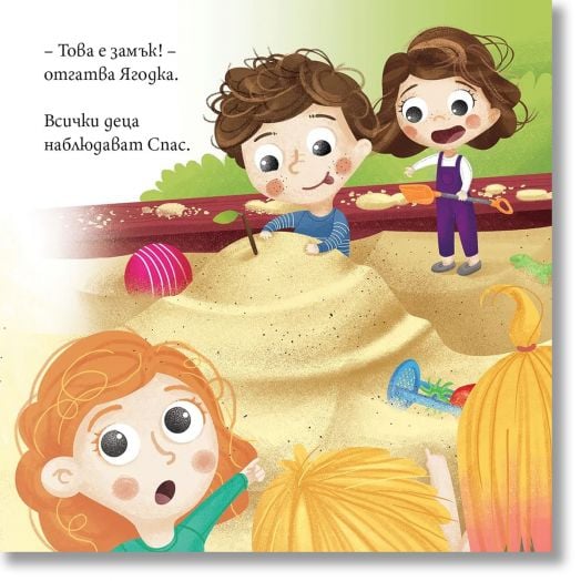 Докато другите деца започват да споделят, пред Ягодка се разкрива един нов свят – свят, в който заедно могат да създадат нещо много по-голямо и красиво. И така, с малко смелост и една лопатка, се ражда най-впечатляващият пясъчен замък!