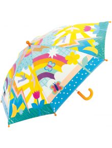 Детски магически чадър Floss & Rock Colour Changing Rainbows с дъги, цветя, пеперуди, птици, символи на мира и слънца върху син фон с бели точки и оранжева дръжка.