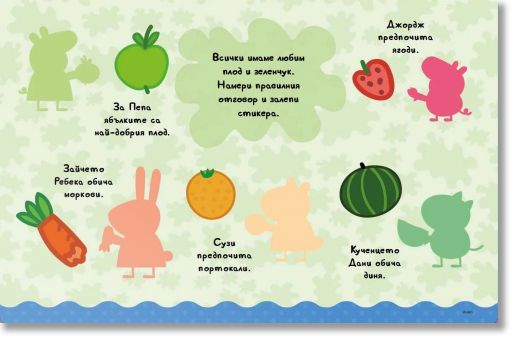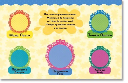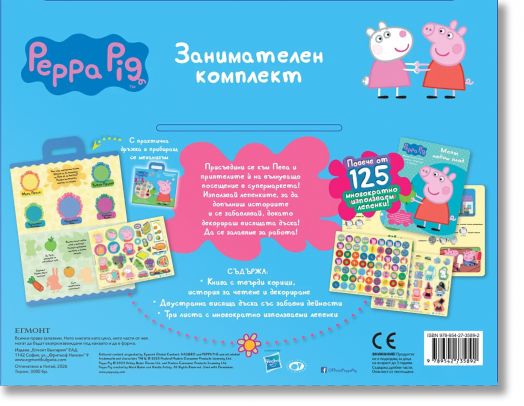 Децата могат да използват лепенките, за да допълват сцените и да украсяват страниците, докато следват Пепа и приятелите ѝ в тяхното пазаруване. Освен това ги очаква и двустранна висяща дъска с разнообразни занимателни дейности, която може да бъде декорирана отново и отново с многократно използваемите лепенки.