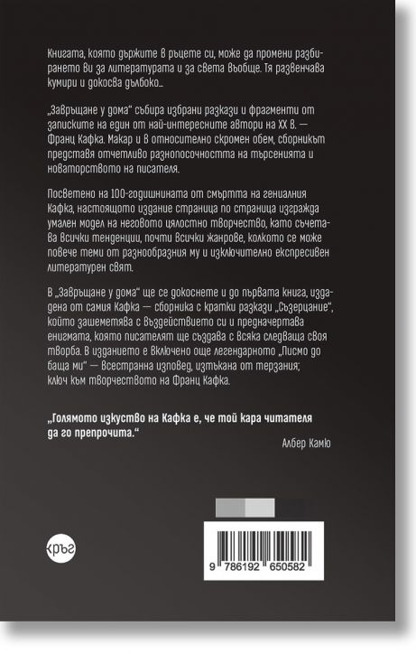 В „Завръщане у дома“ ще се докоснете и до първата книга, издадена от самия Кафка – сборника с кратки разкази „Съзерцание“, който зашеметява с въздействието си и предначертава енигмата, която писателят ще създава с всяка следваща своя творба. В изданието е включено още легендарното „Писмо до баща ми“ – всестранна изповед, изтъкана от терзания; ключ към творчеството на Франц Кафка.