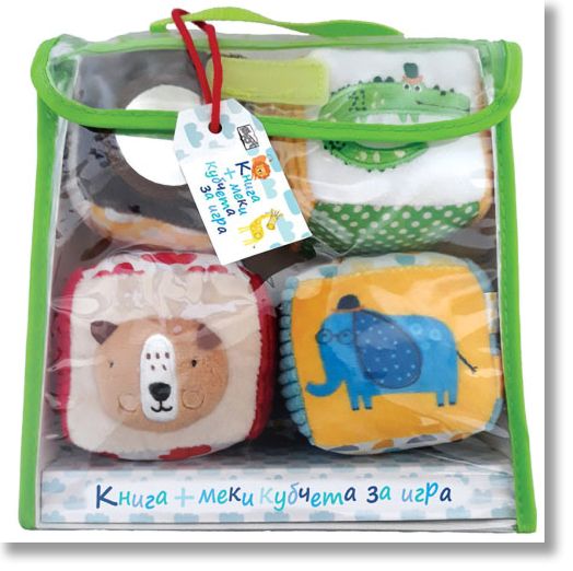 Комплект от картонена книга и 4 меки кубчета от плат с мек пълнеж и вградени пискалка, дрънкалка, огледало, метално звънче.