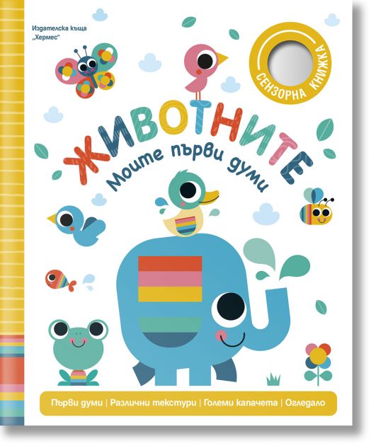 С пъстри илюстрации, различни текстури, капачета и огледало книгата „Животните. Моите първи думи“ е идеалната първа среща със света.